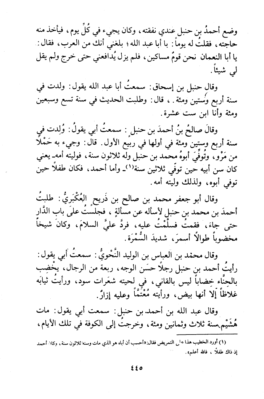 (1) أورد الخطيب هذا على التمريض فقال: أحسب أن أباه هو الذي مات وسنة ثلاثون سنة وكان أحمد إذ ذاك طفلا، فالله أعلم."
