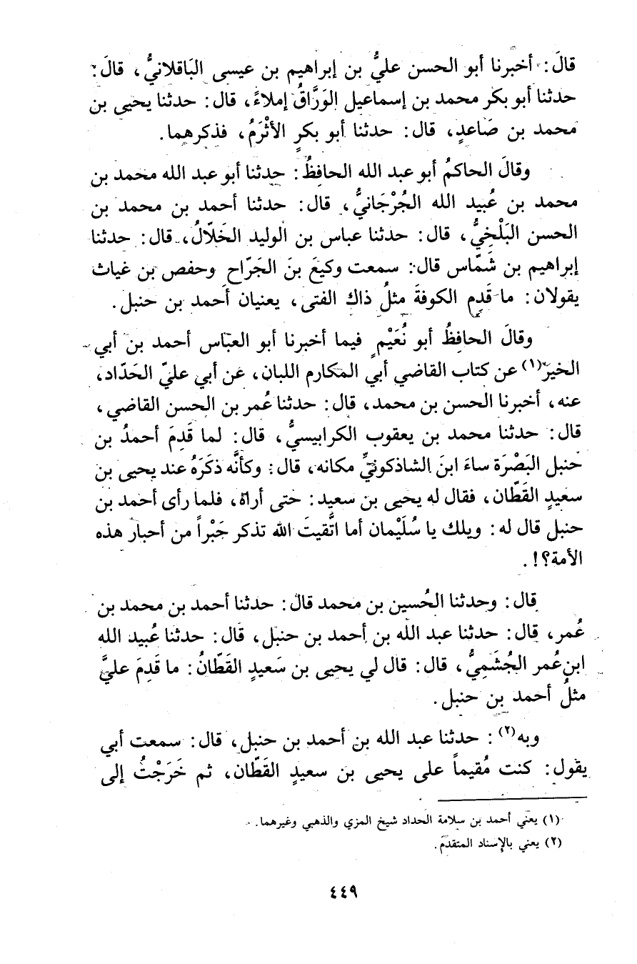 قال: وحَدَّثَنَا الحسين بْن مُحَمَّد قال: حَدَّثَنَا أَحْمَد بْن مُحَمَّد بْن عُمَر، قال: حَدَّثَنَا عَبد اللَّهِ بْن أَحْمَد بْن حنبل، قال: حَدَّثَنَا عُبَيد اللَّهِ بْن عُمَر الجشمي، قال: قال لي يحيى بْن سَعِيد القطان: ما قدم علي مثل أَحْمَد بْن حنبل.