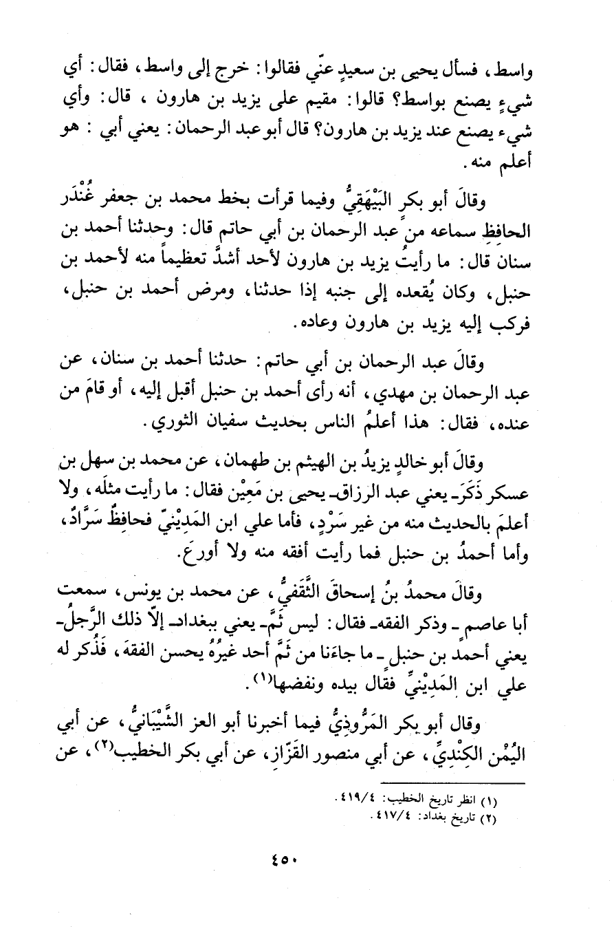 وَقَال أَبُو بَكْر البيهقي وفيما قرأت بخط مُحَمَّد بْن جَعْفَر غندر الْحَافِظ سماعه من عَبْد الرَّحْمَنِ بْن أَبي حَاتِم قال: وحَدَّثَنَا أَحْمَد بْن سنان قال: ما رأيت يزيد بْن هارون لأحد أشد تعظيما منه لأحمد بْن حنبل، وكان يقعده إِلَى جنبه إذا حَدَّثَنَا، ومرض أَحْمَد بْن حنبل، فركب إليه يزيد بْن هارون وعاده.