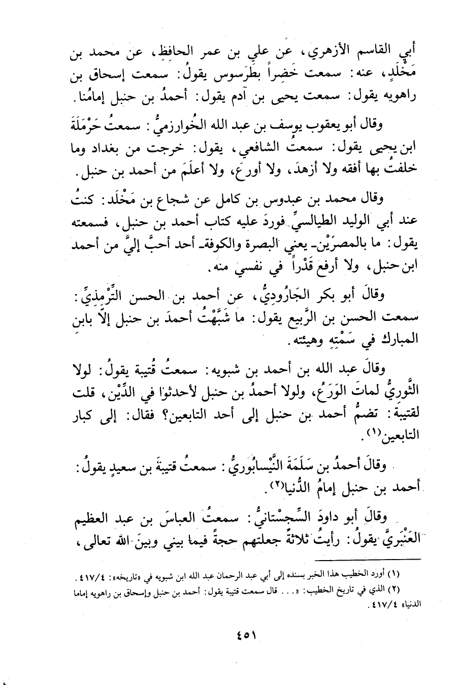 (2) الذي في تاريخ الخطيب: ... قال سمعت قتيبة يقول: أحمد بْن حنبل وإسحاق بْن راهويه إماما الدنيا"4 / 417.