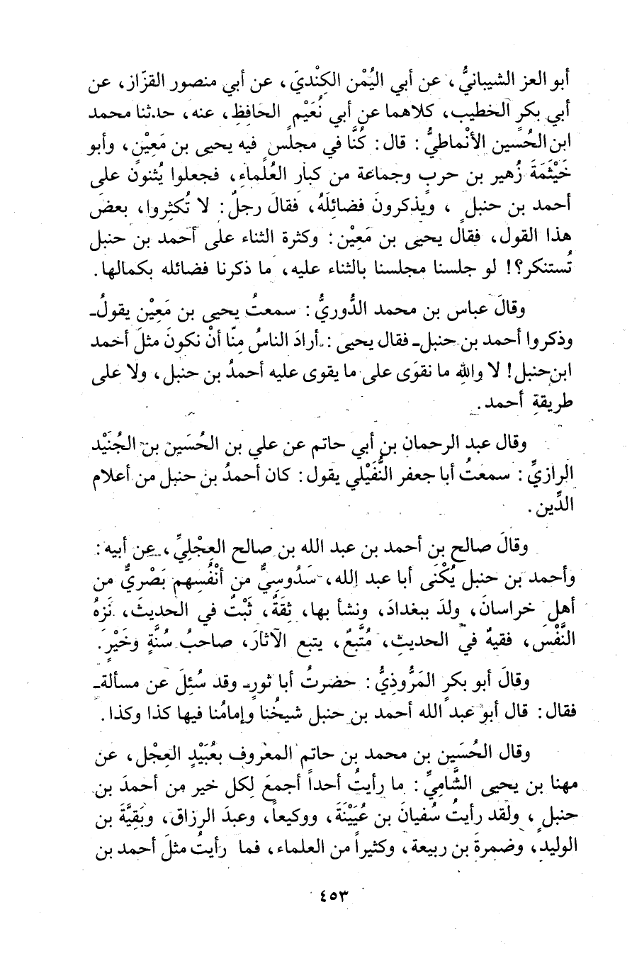 أَبُو الْعِزِّ الشَّيْبَانِيُّ، عَن أَبِي الْيُمْنِ الْكُنْدِيِّ، عَن أَبِي مَنْصُورٍ الْقَزَّاز، عَن أَبِي بَكْر الْخَطِيب، كلاهما عَن أَبِي نعيم الْحَافِظ، عنه، حَدَّثَنَا محمد ابن الحسين الأنماطي: قال: كنا فِي مجلس فيه يحيى بْن مَعِين، وأَبُو خيثمة زهير بْن حرب وجماعة من كبار العلماء، فجعلوا يثنون على أَحْمَد بْن حنبل، ويذكرون فضائله، فَقَالَ رجل: لا تكثروا، بعض هذا القول، فَقَالَ يحيى بْن مَعِين: وكثرة الثناء على أَحْمَد بْن حنبل تستنكر؟ ! لو جلسنا مجلسنا بالثناء عَلَيْهِ، ما ذكرنا فضائله بكمالها.
