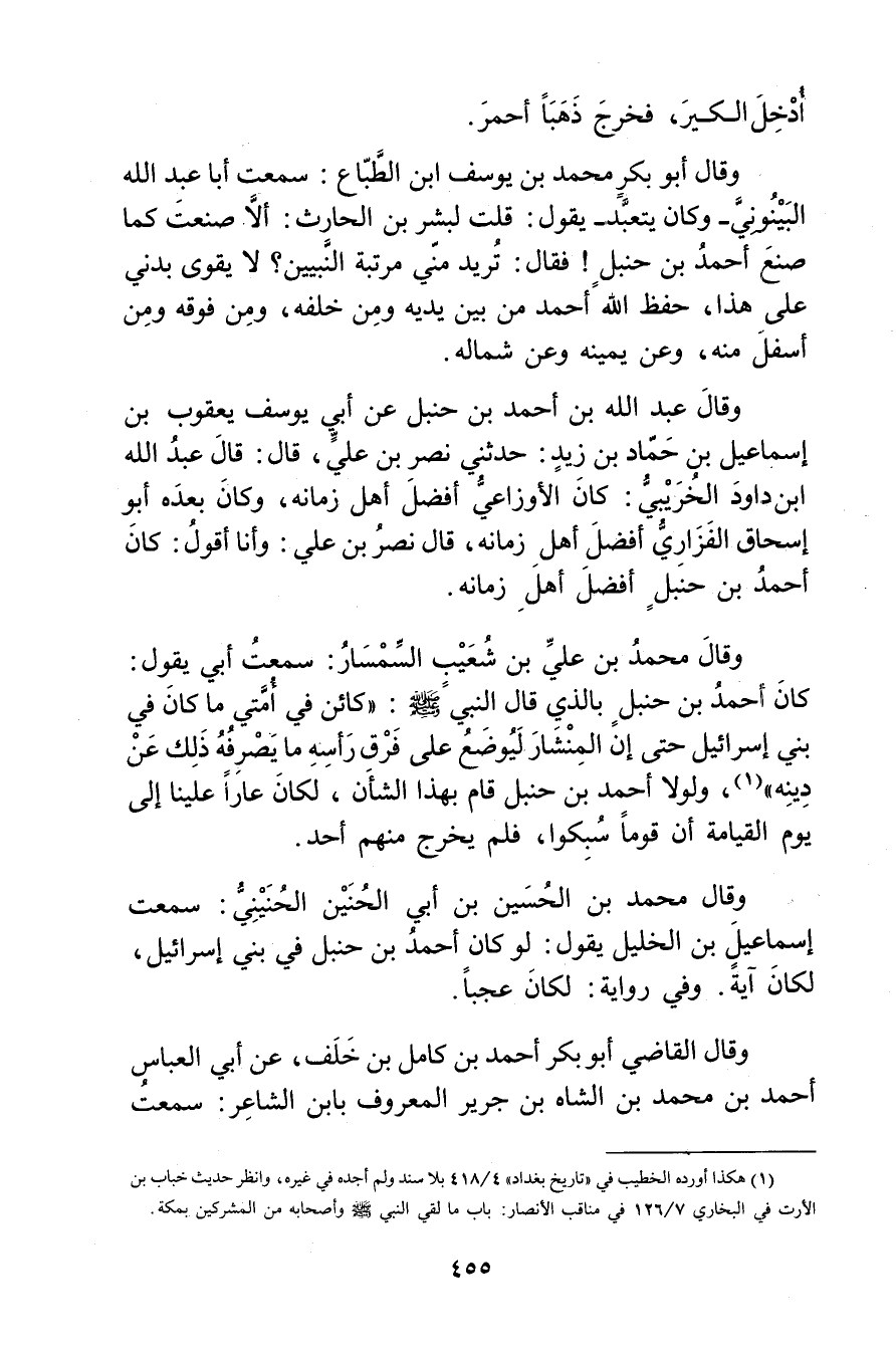 وَقَال مُحَمَّد بْن الحسين بْن أَبي الحنين الحنيني: سمعت إِسْمَاعِيل بْن الخليل يَقُول: لو كَانَ أَحْمَد بْن حنبل فِي بني إسرائيل، لكان آية. وفي رواية: لكان عجبا.