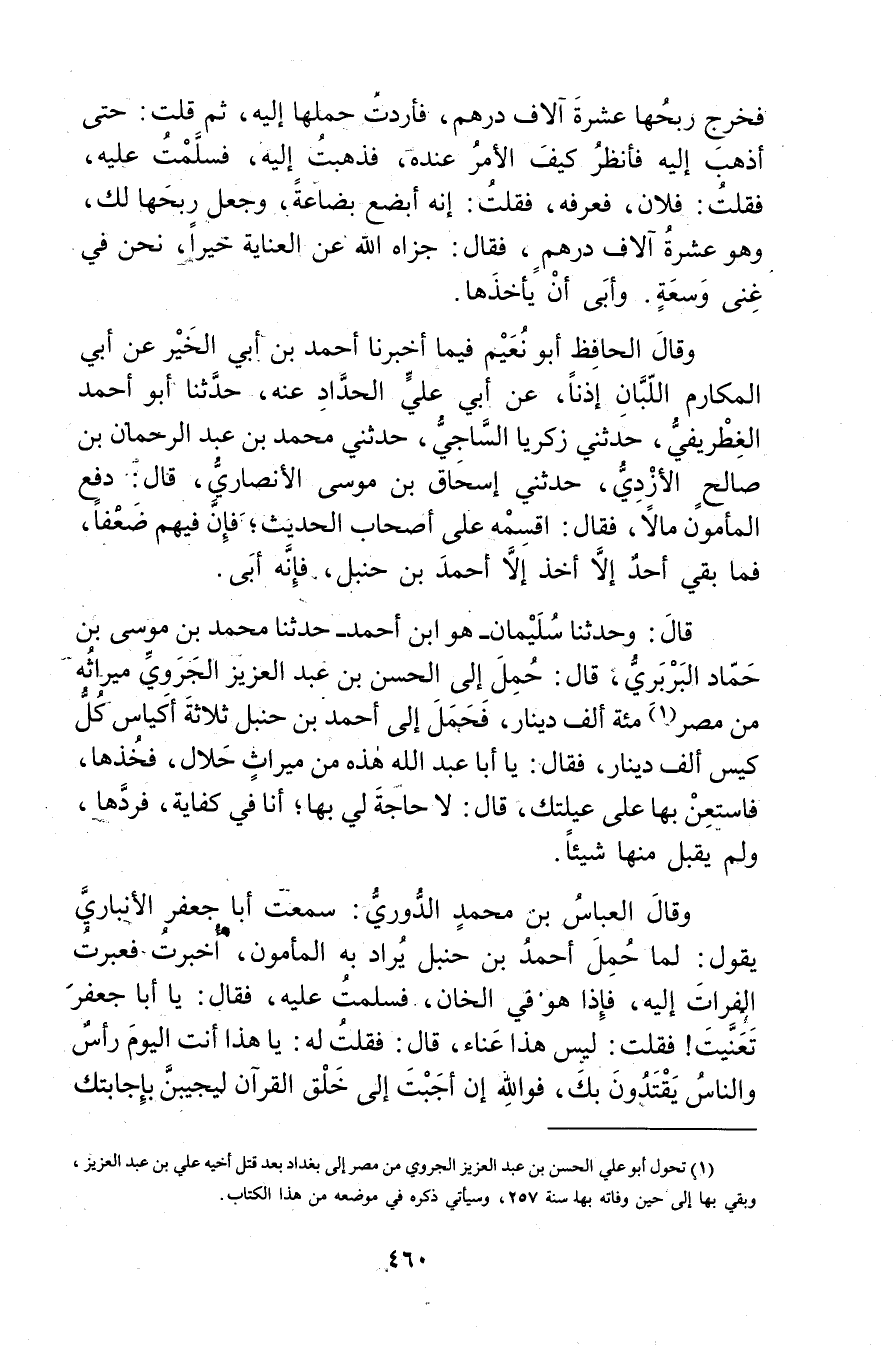 قال: وحَدَّثَنَا سُلَيْمان هو ابْن أَحْمَد حَدَّثَنَا مُحَمَّد بْن مُوسَى بْن حَمَّاد البربري، قال: حمل إِلَى الْحَسَن بْن عَبْد الْعَزِيزِ الجروي ميراثه من مصر (1) مئة ألف دينار، فحمل إِلَى أَحْمَد بْن حنبل ثلاثة أكياس كل كيس ألف دينار، فَقَالَ: يا أَبَا عَبد اللَّهِ هذه من ميراث حلال، فخذها، فاستعن بِهَا على عيلتك، قال: لا حاجة لي بِهَا، أنا فِي كفاية، فردها، ولم يقبل منها شيئا.