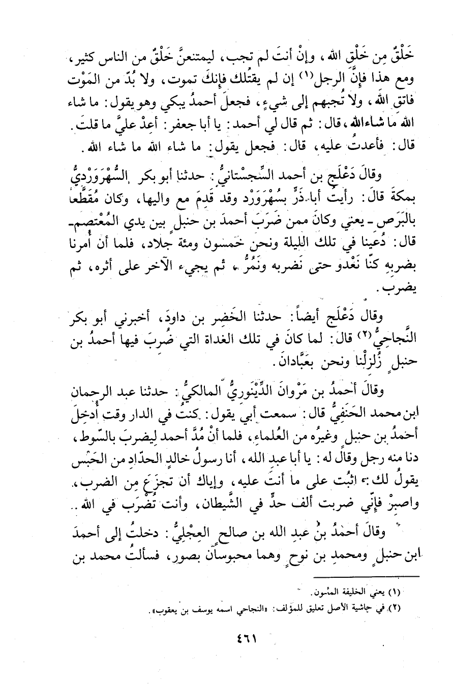خلق من خلق الله، وإن أنت لم تجب، ليمتنعن خلق من الناس كثير، ومع هذا فإن الرجل (1) إن لم يقتلك فإنك تموت، ولا بد من الموت فاتق الله، ولا تجبهم إِلَى شيء، فجعل أَحْمَد يبكي وهو يَقُول: ما شاء الله ما شاء الله، قال: ثم قال لي أَحْمَد: يا أَبَا جَعْفَر: أعد علي ما قلت. قال: فأعدت عَلَيْهِ، قال: فجعل يَقُول: ما شاء الله ما شاء الله.