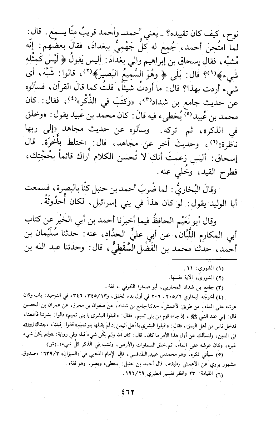 نوح، كيف كَانَ تقييده؟ يعني أَحْمَد وأَحْمَد قريب منا يسمع. قال: لما امتحن أَحْمَد، جمع لَهُ كل جهمي ببغداد، فَقَالَ بعضهم: إنه مشبه، فَقَالَ إسحاق بْن إِبْرَاهِيم والي بغداد: أليس يقول {ليس كمثله شئ) {1) ؟ قال: بلى {وهو السميع البصير) {2) ، قَالُوا: شبه، أي شيء أردت بهذا؟ قال: ما أردت شيئا، قلت كما قال القرآن، فسألوه عَنْ حديث جامع بْن شداد (3) ،"وكتب فِي الذكر" (4) ، فَقَالَ: كَانَ محمد بن عُبَيد (5) يخطئ فيه قال: كَانَ مُحَمَّد بْن عُبَيد يَقُول: وخلق فِي الذكر"، ثم تركه. وسألوه عَنْ حديث مجاهد"إِلَى ربها ناظرة" (6) ، وحديث آخر عَنْ مجاهد، قال: اختلط بآخرة. قال إسحاق: أليس زعمت أنك لا تحسن الكلام أراك قائما بحجتك، فطرح القيد، وخلي عَنْهُ.