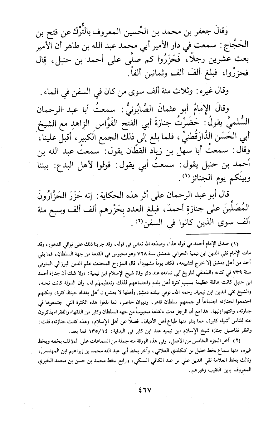 قال أَبُو عَبْد الرَّحْمَنِ على أثر هذه الحكاية: إنه حزر الحزارون المصلين على جنازة أَحْمَد، فبلغ العدد بحزرهم ألف ألف وسبع مئة ألف سوى الذين كانوا فِي السفن (2) .
