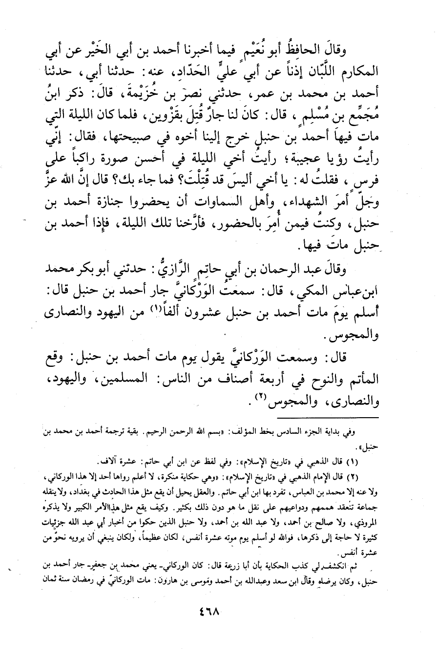 (2) قال الإمام الذهبي في "تاريخ الاسلام": وهي حكاية منكرة، لا أعلم رواها أحد إلا هذا الوركاني، ولا عنه إلا محمد بن العباس، تفرد بها ابن أَبي حاتم. والعقل يحيل أن يقع مثل هذا الحادث في بغداد، ولا ينقله جماعة تنعقد هممهم ودواعيهم على نقل ما هو دون ذلك بكثير. وكيف يقع مثل هذا الامر الكبير ولا يذكره المروذي، ولا صالح بن أحمد، ولا عَبد الله بن أحمد، ولا حنبل الذين حكوا من أخبار أبي عَبد الله جزئيات كثيرة لا حاجة إلى ذكرها، فوالله لو أسلم يوم موته عشرة أنفس، لكان عظيما، ولكان ينبغي أن يرويه نحو من عشرة أنفس.