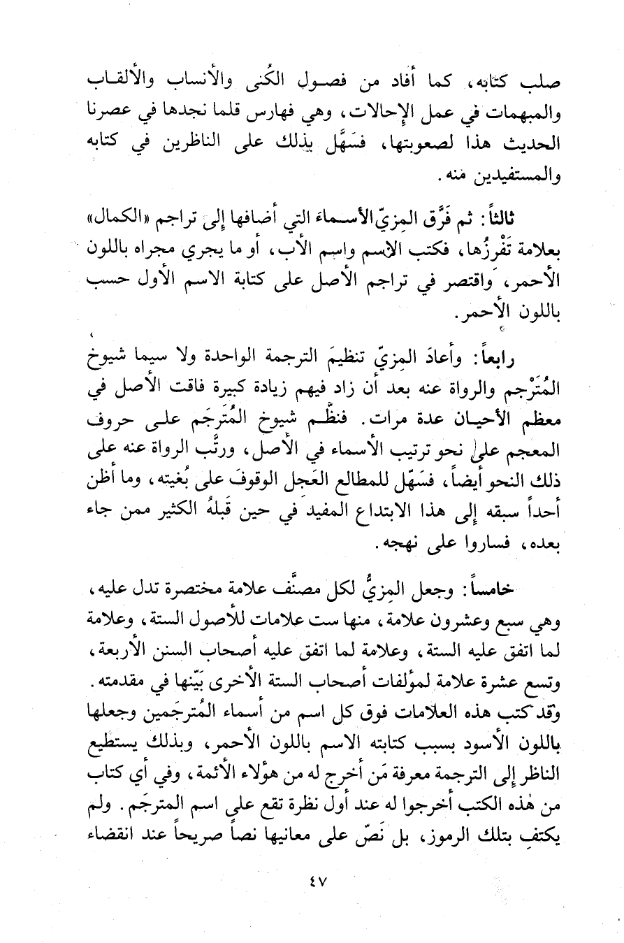 ثالثا: ثم فرق المزي الأَسماء التي أضافها إلى تراجم "الكمال" بعلامة تفرزها، فكتب الاسم واسم الاب، أو ما يجري مجراه باللون الاحمر, واقتصر في تراجم الاصل على كتابة الاسم الاول حسب باللون الاحمر.