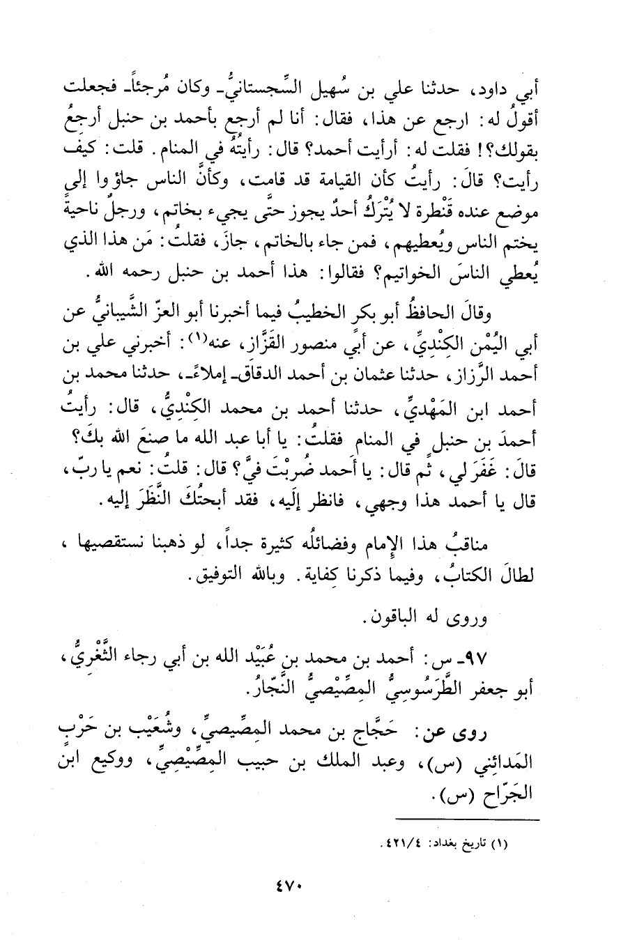 أَبِي داود، حَدَّثَنَا علي بْن سهيل السجستاني وكان مرجئا فجعلت أقول لَهُ: ارجع عَنْ هذا، فَقَالَ: أنا لم أرجع بأحمد بْن حنبل أرجع بقولك؟ ! فقلت لَهُ: أرأيت أَحْمَد؟ قال: رأيته فِي المنام. قلت: كيف رأيت؟ قال: رأيت كأن القيامة قد قامت، وكأن الناس جاؤوا إِلَى موضع عنده قنطرة لا يترك أحد يجوز حتى يجئ بخاتم، ورجل ناحية يختم الناس ويعطيهم، فمن جاء بالخاتم، جاز، فقلت: من هذا الذي يعطي الناس الخواتيم؟ فقالوا: هذا أَحْمَد بْن حنبل رحمه الله.
