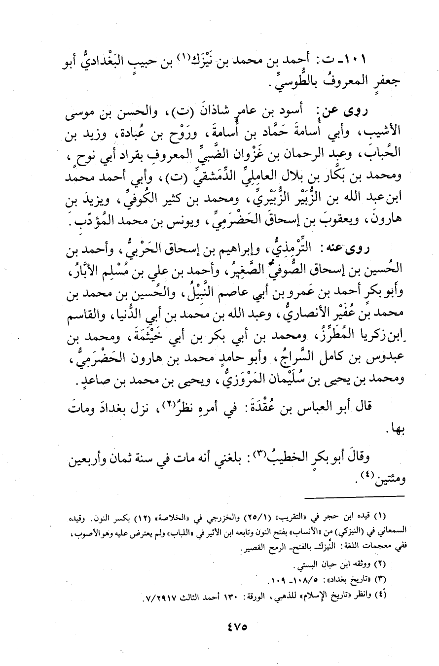 101- ت: أَحْمَد بن مُحَمَّد بن نيزك (1) بن حبيب الْبَغْدَادِيّ أَبُو جَعْفَر المعروف بالطوسي.
