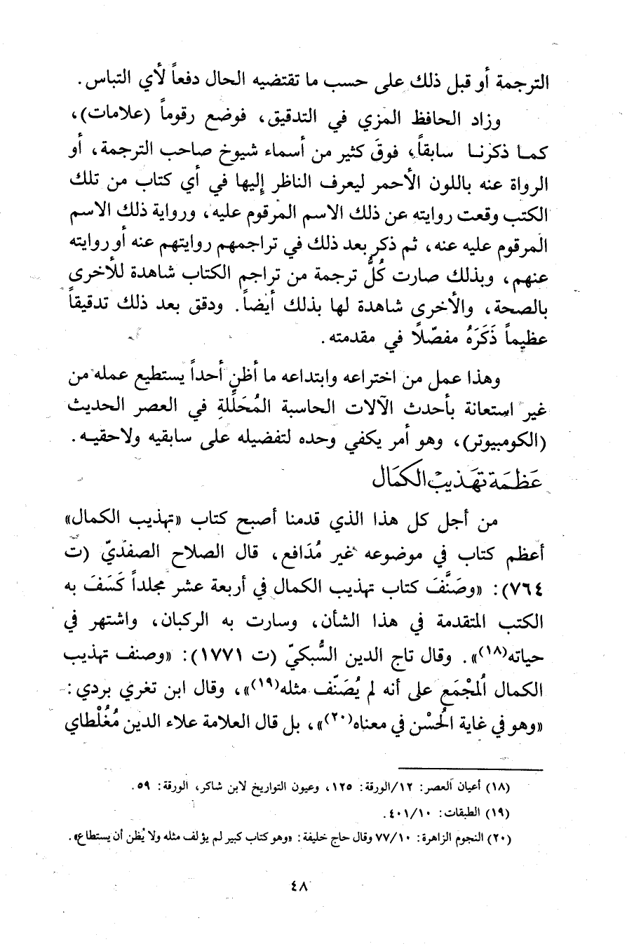من أجل كل هذا الذي قدمنا أصبح كتاب"تهذيب الكمال"أعظم كتاب في موضوعه غير مدافع، قال الصلاح الصفدي (ت 764) : وصنف كتاب تهذيب الكمال في أربعة عشر مجلدا كسف به الكتب المتقدمة في هذا الشأن، وسارت به الركبان، واشتهر في حياته (1) ". وَقَال تاج الدين السبكي (ت 1771) : وصنف تهذيب الكمال المجمع على أنه لم يصنف مثله (2) "، وَقَال ابن تغري بردي: وهو في غاية الحسن في معناه (3) "، بل قال العلامة علاء الدين مغلطاي