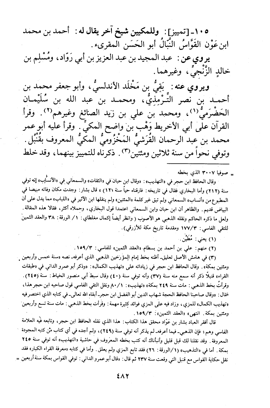 المعروفة. وقد نقلنا لك قبل قليل وأنبأناك أنه كتب بخطه المروف في حاشية"التهذيب"أنه توفي سنة 245 بمكة. أما في "التذهيب" (1 / الورقة: 26) فقد تابع المزي ولم يعلق. وأما في كتابه"معرفة القراء الكبار"فقد نقل حكاية القواس مع قنبل التي وقعت سنة 237 ثم قال: قال أبو عَمْرو الداني: توفي القواس بمكة سنة أربعين =