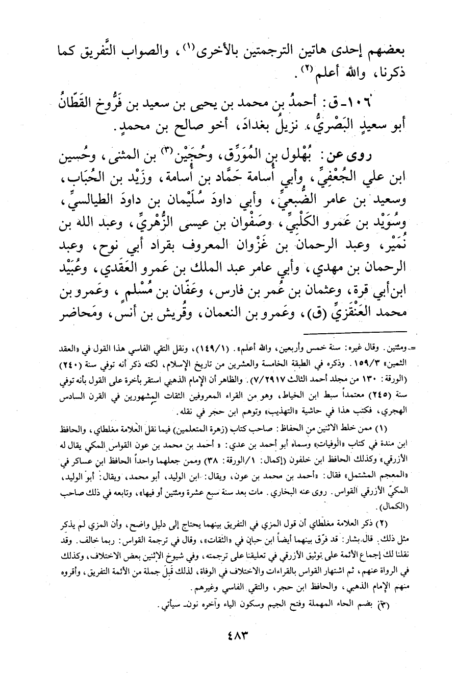 106- ق: أَحْمَد بن مُحَمَّد بن يحيى بن سَعِيد بن فروخ القطان أَبُو سَعِيد البَصْرِيّ، نزيل بغداد، أخو صَالِح بْن مُحَمَّد.