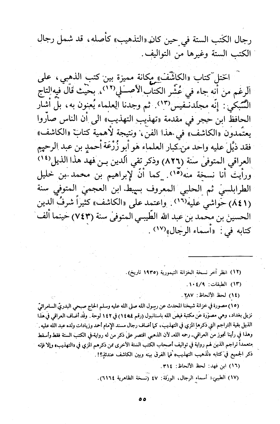 (4) مصورة في خزانة شيخنا المحدث عن رَسُولِ اللَّهِ صَلَّى اللَّهُ عليه وسلم الحاج صبحي البدري السامرائي نزيل بغداد، وهي مصورة عن مكتبة فيض الله باستانبول (رقم 1454) في 142 لوحة. وقد أضاف العراقي في هذا الذيل بقية التراجم التي ذكرها المزي في التهذيب، كما أضاف رجال مسند الإمام أحمد وزيادات ولده عَبد الله عليه. وهذا في رأينا تجوز من العراقي رحمه الله لان الذهبي اقتصر على ذكر من له رواية في الكتب الستة فقط وأسقط متعمدا تراجم الدين لهم رواية في تواليف أصحاب الكتب الستة الاخرى ممن ذكرهم المزي في "التهذيب"وإلا فإنه ذكر الجميع في كتابه"تذهيب التهذيب"فما الفرق بينه وبين الكاشف عندئذ؟ !.