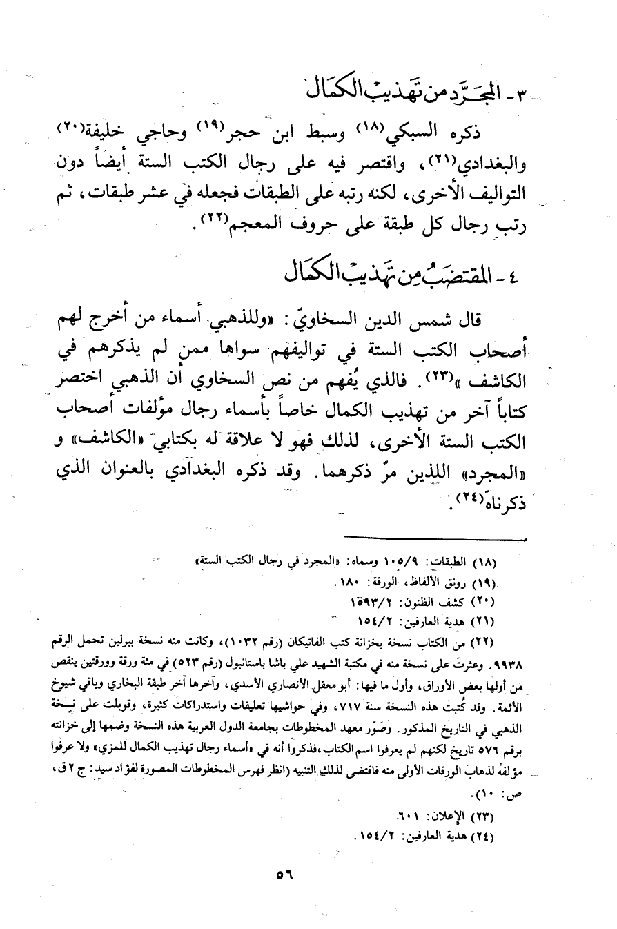 فالذي يفهم من نص السخاوي أن الذهبي اختصر كتابا آخر من تهذيب الكمال خاصا بأسماء رجال مؤلفات أصحاب الكتب الستة الاخرى، لذلك فهو لا علاقة له بكتابي"الكاشف"و"المجرد"اللذين مر ذكرهما. وقد ذكره البغدادي بالعنوان الذي ذكرناه (7) .