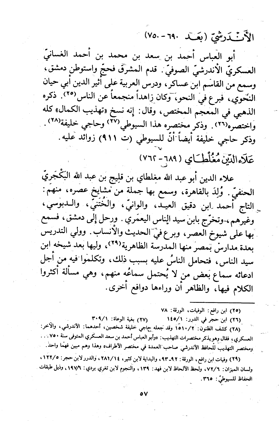 (28) كشف الظنون: 2 / 1510 وقد جعله حاجي خليفة شخصين، أحدهما: الاندرشي والآخر: العسكري، فقال وهو يذكر مختصرات التهذيب: وأبو العباس أحمد بن سعد العسكري المتوفى سنة 750..ومختصر التهذيب للحافظ الاندرشي صاحب العمدة في مختصر الاطراف"وهذا وهم مبين فهما واحد.