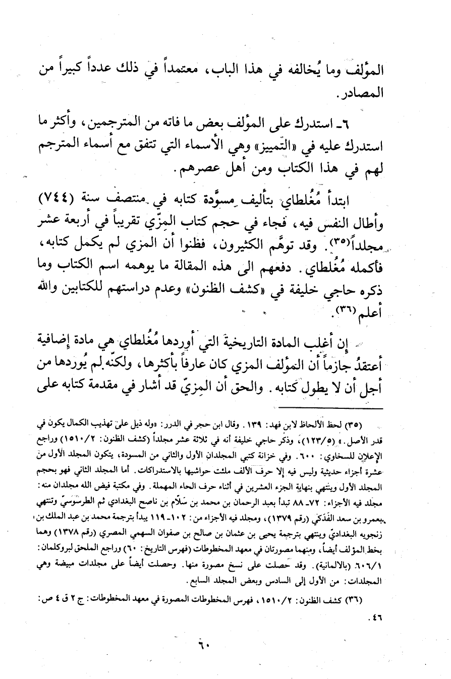 إن أغلب المادة التاريخية التي أوردها مغلطاي هي مادة إضافية أعتقد جازما أن المؤلف المزي كان عارفا بأكثرها، ولكنه لم يوردها من أجل أن لا يطول كتابه. والحق أن المزي قد أشار في مقدمة كتابه على
