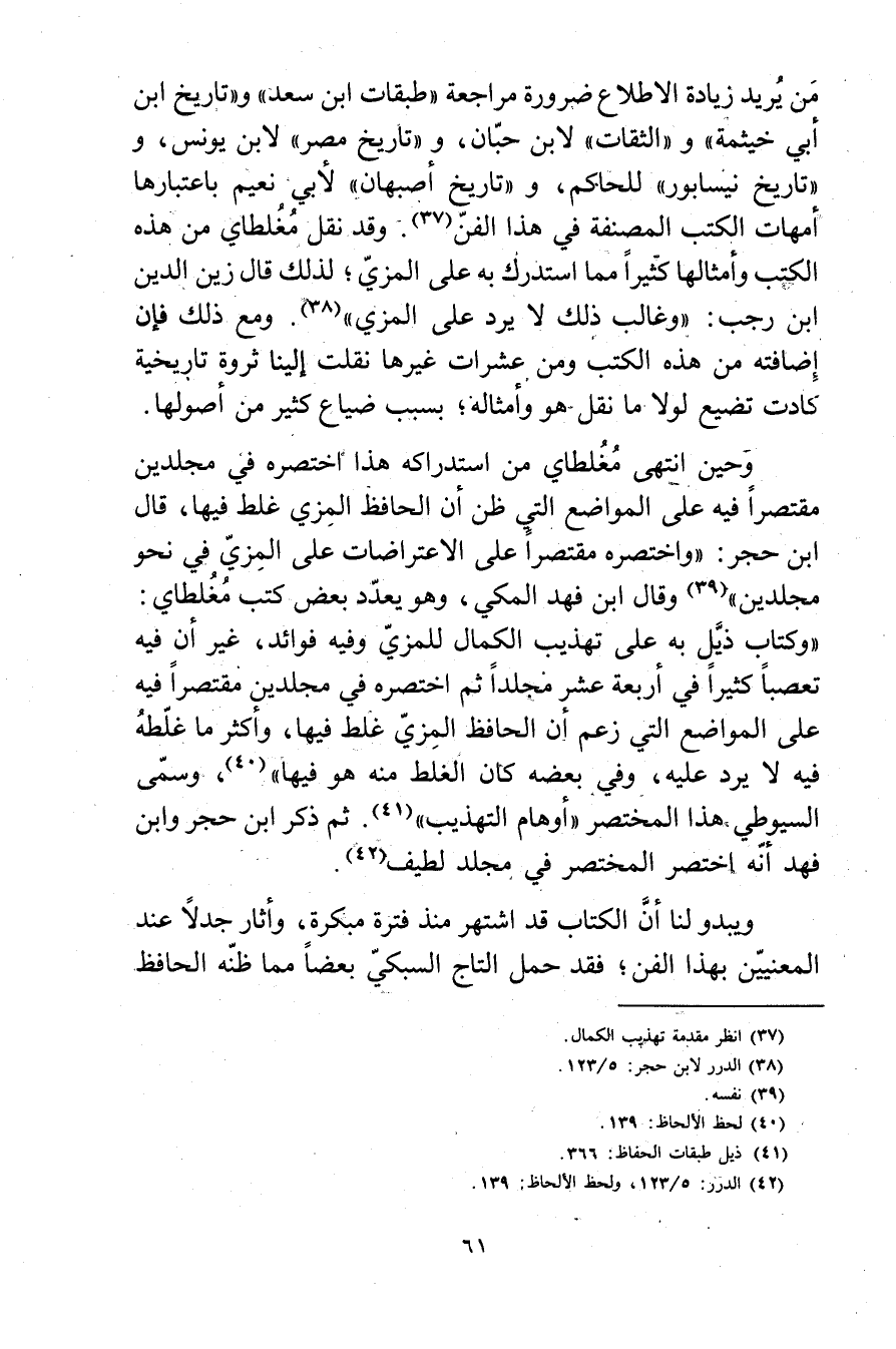 من يريد زيادة الاطلاع ضرورة مراجعة"طبقات ابن سعد"و"تاريخ ابن أَبي خيثمة"و "الثقات" لابن حبان، و"تاريخ مصر"لابن يونس، و"تاريخ نيسابور"للحاكم، و"تاريخ أصبهان"لابي نعيم باعتبارها أمهات الكتب المصنفة في هذا الفن (1) . وقد نقل مغلطاي من هذه الكتب وأمثالها كثيرا مما استدرك به على المزي، لذلك قال زين الدين ابن رجب: وغالب ذلك لا يرد على المزي" (2) . ومع ذلك فإن إضافته من هذه الكتب ومن عشرات غيرها نقلت إلينا ثروة تاريخية كادت تضيع لولا ما نقل هو وأمثاله، بسبب ضياع كثير من أصولها.