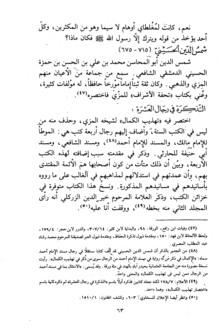 (2) من الجدير بالذكر أن شمس الدين الحسيني قد ألف كتابا مستقلا في رجال مسند الإمام أحمد سماه: الاكمال في ذكر من له رواية في مسند الإمام أحمد من الرجال سوى من ذكر في تهذيب الكمال.