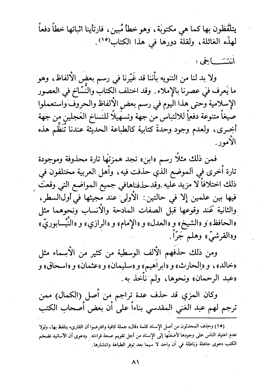 فمن ذلك مثلا رسم"ابن"تجد همزتها تارة محذوفة وموجودة تارة أخرى في الموضع الذي حذفت فيه، وأهل العربية مختلفون في ذلك اختلافا لا مزيد عليه. وقد حذفناها في جميع المواضع التي وقعت فيها بين علمين إلا في حالتين: الاولى عند مجيئها في أول السطر، والثانية عند وقوعها قبل الصفات المادحة والانساب ونحوهما مثل"الحافظ"و"الشيخ"و"العدل"و"الإمام"و"الرازي"و"النيسابوري"و"القرشي"وهلم جرا.