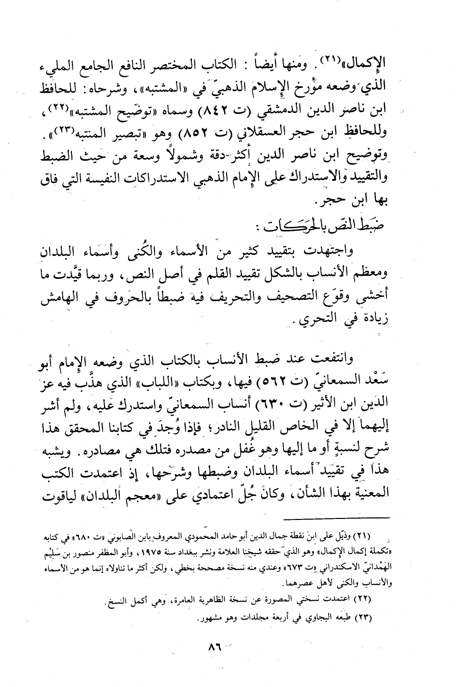 الاكمال" (1) . ومنها أيضا: الكتاب المختصر النافع الجامع الملئ الذي وضعه مؤرخ الاسلام الذهبي في "المشتبه"وشرحاه: للحافظ ابن ناصر الدين الدمشقي (ت 842) وسماه"توضيح المشتبه" (2) ، وللحافظ ابن حجر العسقلاني (ت 852) وهو"تبصير المنتبه (3) .