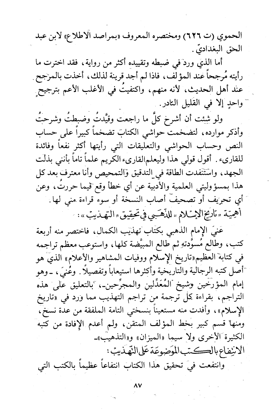 وعني، وهو إمام المؤرخين وشيخ المعدلين والمجرحين، بالتعليق على هذه التراجم، بقراءة كل ترجمة من تراجم التهذيب مما ورد في "تاريخ الاسلام"، وأفدت منه مستعينا بنسختي التامة الملفقة من عدة نسخ، ومنها قسم كبير بخط المؤلف المتقن، ولم أعدم الافادة من كتبه الكثيرة الاخرى ولا سيما"الميزان"و"التذهيب"