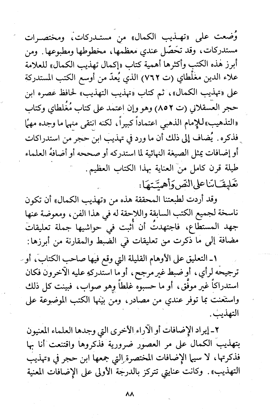 وقد أردت لطبعتنا المحققة هذه من"تهذيب الكمال"أن تكون ناسخة لجميع الكتب السابقة واللاحقة له في هذا الفن، ومعوضة عنها جهد المستطاع، فاجتهدت أن أثبت في حواشيها جملة تعليقات مضافة إلى ما ذكرت من تعليقات في الضبط والمقارنة من أبرزها: