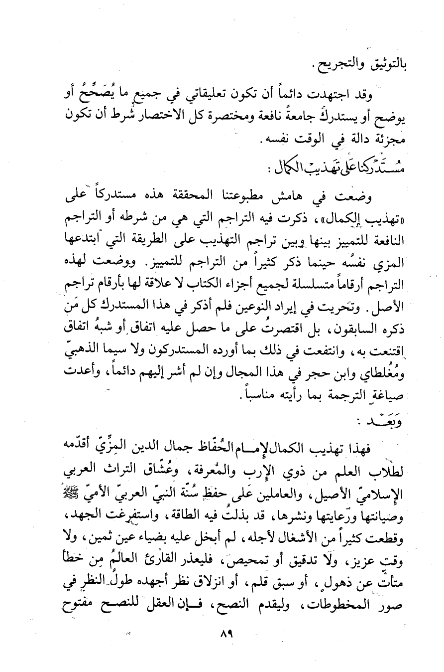 فهذا تهذيب الكمال لامام الحافظ جمال الدين المزي أقدمه لطلاب العلم من ذوي الارب والمعرفة، وعشاق التراث العربي الاسلامي الاصيل، والعاملين على حفظ سنة النبي العربي الامي صلى الله عليه وسلم وصيانتها ورعايتها ونشرها، قد بذلت فيه الطاقة، واستفرغت الجهد، وقطعت كثيرا من الاشغال لاجله، لم أبخل عليه بضياء عين ثمين، ولا وقت عزيز، ولا تدقيق أو تمحيص، فليعذر القارئ العالم من خطأ متأت عن ذهول، أو سبق قلم، أو انزلاق نظر أجهده طول النظر في صور المخطوطات، وليقدم النصح، فإن العقل للنصح مفتوح