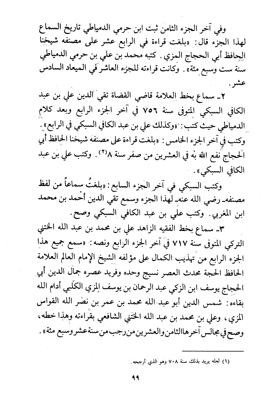 2- سماع بخط العلامة قاضي القضاة تقي الدين علي بن عبد الكافي السبكي المتوفى سنة 756 في آخر الجزء الرابع وبعد كلام الدمياطي حيث كتب: وكذلك علي بن عبد الكافي السبكي في الرابع". وكتب في آخر الجزء الخامس: بلغت قراءة على مصنفه شيخنا الحافظ أبي الحجاج نفع الله به في العشرين من صفر سنة 8 (2) . وكتب علي بن عبد الكافي السبكي.