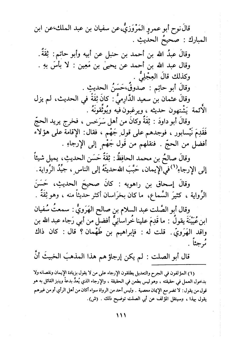 (1) المؤلفون في الجرح والتعديل يطلقون الارجاء على من لا يقول بزيادة الايمان ونقصانه ولا بدخول العمل في حقيقته، وهو ليس بطعن في الحقيقة، والارجاء الذي يعد بدعة وينبز القائل به هو قول من يقول: لا تضر مع الايمان معصية. وليس أحد من الرواة سواء أكان من أهل الرأي أو من غيرهم يقول بهذا، وسينقل المؤلف عَن أبي الصلت توضيح ذلك.