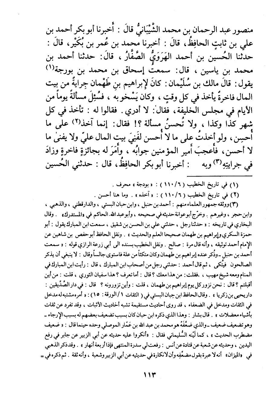 مَنْصُورٍ عَبْدُ الرَّحْمَنِ بْنُ مُحَمَّدِ الشيباني قال: أَخْبَرَنَا أبو بكر أَحْمَدُ بْنُ عَلِيِّ بْنِ ثَابِتٍ الحافظ، قال: أَخْبَرَنَا مُحَمَّد بْن عُمَر بْن بكير، قال: حَدَّثَنَا الحسين بْن أحمد الهروي الصفار، قال: حَدَّثَنَا أَحْمَد بْن مُحَمَّد بْن ياسين، قال: سمعت إسحاق بْن مُحَمَّد بْن بورجة (1) يقول: قال مالك بْن سُلَيْمان: كان لإبراهيم بْن طهمان جراية من بيت المال فاخرة يأخذ في كل وقت، وكان يسخو به، فسئل مسألة يوما من الأيام في مجلس الخليفة، فَقَالَ: لا أدري.