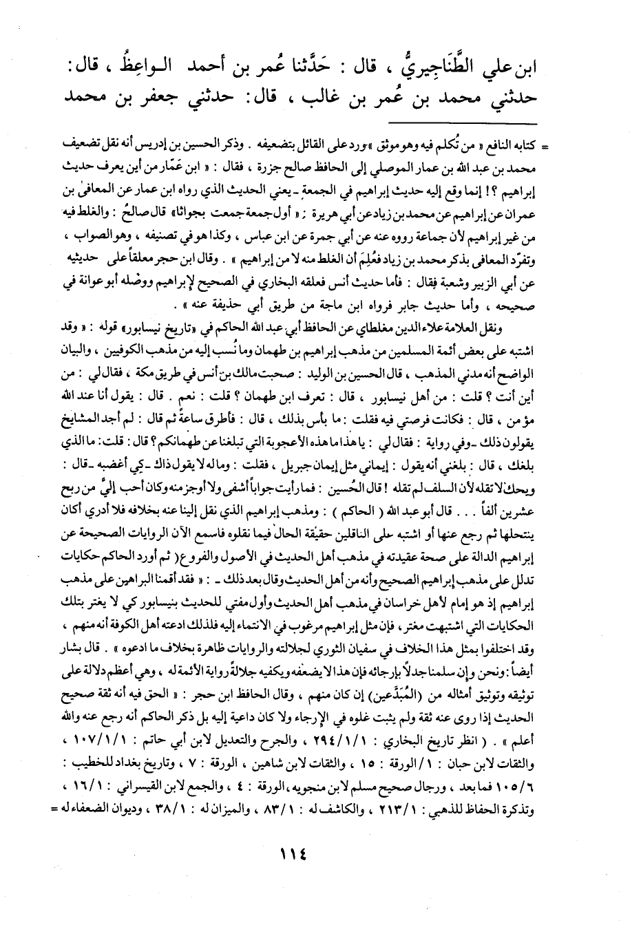 = كتابه النافع"من تكلم فيه وهو موثق"ورد على القائل بتضعيفه. وذكر الحسين بن إدريس أنه نقل تضعيف محمد بن عَبد الله بن عمار الموصلي إلى الحافظ صالح جزرة، فقال: ابن عمار من أين يعرف حديث إبراهيم؟ ! إنما وقع إليه حديث إبراهيم في الجمعة، يعني الحديث الذي رواه ابن عمار عن المعافى بن عِمْران عن إبراهيم عن محمد بن زياد عَن أبي هُرَيْرة: أول جمعة جمعت بجواثا"قال صالح: والغلط فيه من غير إبراهيم لان جماعة رووه عنه عَن أبي حمزة عن ابن عباس، وكذا هو في تصنيفه، وهو الصواب، وتفرد المعافى بذكر محمد بن زياد فعلم أن الغلط منه لا من إبراهيم". وَقَال ابن حجر معلقا على حديثيه عَن أبي الزبير وشعبة فقال: فأما حديث أنس فعلقه البخاري في الصحيح لابراهيم ووصله أبو عوانة في صحيحه، وأما حديث جابر فرواه ابن ماجة من طريق أبي حذيفة عنه". ونقل العلامة علاء الدين مغلطاي عن الحافظ أبي عَبد الله الحاكم في "تاريخ نيسابور"قوله: وقد اشتبه على بعض أئمة المسلمين من مذهب إبراهيم بن طهمان وما نسب إليه من مذهب الكوفيين، والبيان الواضح أنه مدني المذهب، قال الحسين بن الوليد: صحبت مالك بن أنس في طريق مكة، فقال لي: من أين أنت؟ قلت: من أهل نيسابور، قال: تعرف ابن طهمان؟ قلت: نعم. قال: يقول أنا عند الله مؤمن، قال: فكانت فرصتي فيه فقلت: ما بأس بذلك، قال: فأطرق ساعة ثم قال: لم أجد المشايخ يقولون ذلك - وفي رواية: فقال لي: يا هذا ما هذه الاعجوبة التي تبلغنا عن طهمانكم؟ قال: قلت: ما الذي بلغك، قال: بلغني أنه يقول: إيماني مثل إيمان جبريل، فقلت: وما له لا يقول ذاك - كي أغضبه، قال: ويحك لا تقله لان السلف لم تقله! قال الحسين: فما رأيت جوابا أشفى ولا أوجز منه وكان أحب إلي من ربح عشرين ألفا..قال أبو عبد الله (الحاكم) : ومذهب إبراهيم الذي نقل إلينا عنه بخلافه فلا أدري أكان ينتحلها ثم رجع عنها أو اشتبه على الناقلين حقيقة الحال فيما نقلوه فاسمع الآن الروايات الصحيحة عن إبراهيم الدالة على صحة عقيدته في مذهب أهل الحديث في الاصول والفروع (ثم أورد الحاكم حكايات تدلل على مذهب إبراهيم الصحيح وأنه من أهل الحديث وَقَال بعد ذلك: فقد أقمنا البراهين على مذهب إبراهيم إذ هو إمام لاهل خراسان في مذهب أهل الحديث وأول مفتي للحديث بنيسابور كي لا يغتر بتلك الحكايات التي اشتبهت مغتر، فإن مثل إبراهيم مرغوب في الانتماء إليه فلذلك ادعته أهل الكوفة أنه منهم، وقد اختلفوا بمثل هذا الخلاف في سفيان الثوري لجلالته والروايات ظاهرة بخلاف ما ادعوه". قال بشار أيضا: ونحن وإن سلمنا جدلا بإرجائه فإن هذا لا يضعفه ويكفيه جلالة رواية الأئمة له، وهي أعظم دلالة على توثيقه وتوثيق أمثاله من (المبدعين) إن كان منهم، وَقَال الحافظ ابن حجر: الحق فيه أنه ثقة صحيح الحديث إذا روى عنه ثقة ولم يثبت غلوه في الارجاء ولا كان داعية إليه بل ذكر الحاكم أنه رجع عنه والله أعلم". (انظر تاريخ البخاري: 1 / 1 / 294، والجرح والتعديل لابن أَبي حاتم: 1 / 1 / 107، والثقات لابن حبان: 1 / الورقة: 15، والثقات لابن شاهين، الورقة: 7، وتاريخ بغداد للخطيب: 6 / 105 فما بعد، ورجال صحيح مسلم لابن منجويه، الورقة: 4، والجمع لابن القيسراني: 1 / 16، وتذكرة الحفاظ للذهبي: 1 / 213، والكاشف له: 1 / 83، والميزان له: 1 / 38، وديوان الضعفاء له =