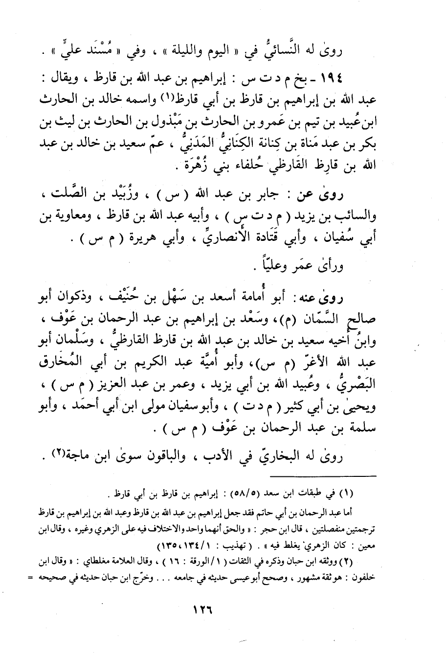 194- بخ م د ت س: إِبْرَاهِيم بْن عَبد اللَّهِ بْن قارظ، ويُقال: عَبد الله بْن إِبْرَاهِيم بْن قارظ بْن أَبي قارظ (1) واسمه خالد بن الحارث