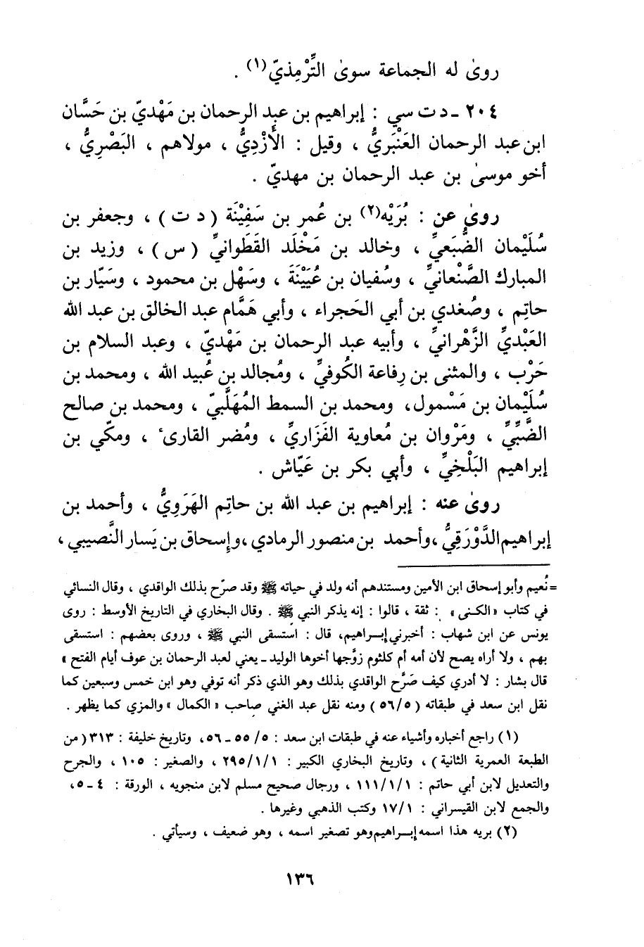 204- د ت سى: إِبْرَاهِيم بن عَبْد الرحمن بن مهدي بن حسان ابن عَبْد الرحمن العنبري، وقيل: الأزدي، مولاهم، البَصْرِيّ، أخو موسى بْن عَبْد الرحمن بْن مهدي.