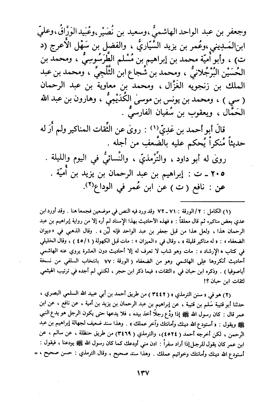 (1) الكامل: 2 / الورقة: 71 - 72 وقد ورد فيه النص في موضعين فجمعا هنا. وقد أورد ابن عدي بعض مناكيره ثم قال معلقا: فهذه الاحاديث بهذا الإسناد لم أره إلا من رواية إبراهيم بن عبد الرحمن هذا، ولعل هذا من قبل جعفر بن عبد الواحد فإنه لين". وَقَال الذهبي في "ديوان الضعفاء": له مناكير قليلة"، وَقَال في "الميزان": مات قبل الكهولة (1: 45) ، وَقَال الخليلي في كتاب"الارشاد": مات وهو شاب لا تعرف له إلا أحاديث دون العشرة يروي عنه الهاشمي أحاديث أنكروها على الهاشمي وهو من الضعفاء (الورقة: 77 بانتخاب السلفي من نسخة إيا صوفيا) .