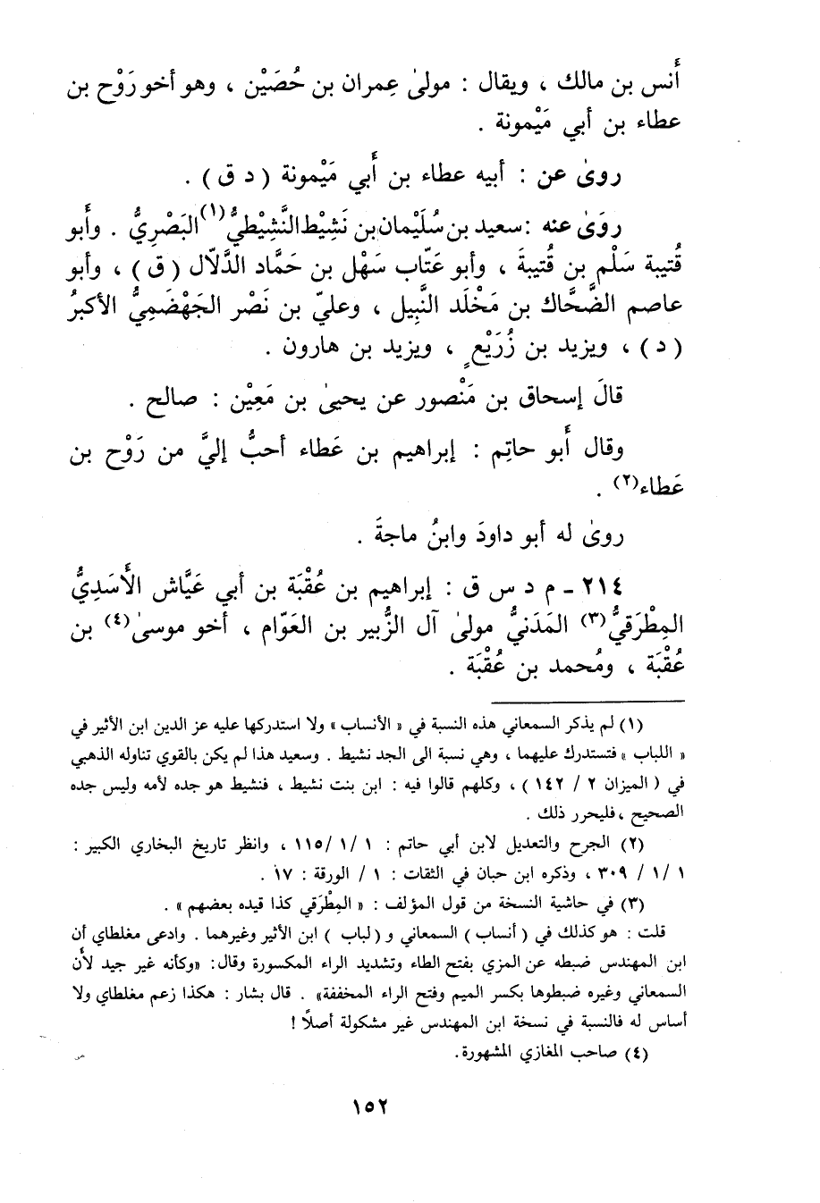 214- م د س ق: إِبْرَاهِيم بن عقبة بن أَبي عياش الأسدي المطرقي (3) المدني مولى آل الزبير بْن العوام، أخو موسى (4) بْن عقبة، ومحمد بن عقبة.