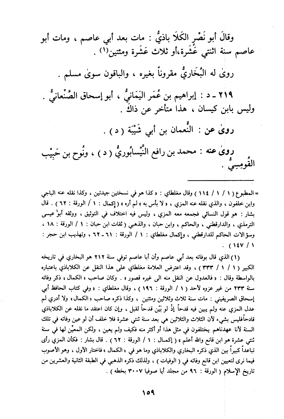 (1) الذي قال بوفاته بعد أبي عاصم وأن أبا عاصم توفي سنة 212 هو البخاري في تاريخه الكبير (1 / 1 / 333) ، وقد اعترض العلامة مغلطاي على هذا النقل عن الكلاباذي باعتباره بالواسطة وَقَال: فالعدول عن النقل منه إلى غيره قصور". وكان صاحب "الكمال" ذكر وفاته سنة 233 من غير عزوه لاحد (1 / الورقة: 196) ، وَقَال مغلطاي: وفي كتاب الحافظ أبي إسحاق الصريفيني: مات سنة ثلاث وثلاثين ومئتين، وكذا ذكره صاحب "الكمال" ولا أدري لم عدل المزي عنه ولم يبين فيه قدحا إذ لو بين قدحا لقبل، وإن كان اعتقد ما نقله عن الكلاباذي قادحا فليس بشيءٍ لان الثلاث والثلاثين هي بعد سنة ثنتي عشرة فلا خلف أن لو عين وفاته في تلك السنة لانا عهدناهم يختلفون في مثل هذا أو أكثر ولم يعين، ولكن المعين لها في سنة ثنتي عشرة هو ابن قانع والله أعلم" (إكمال: 1 / الورقة: 62) . قال بشار: فكأن المزي رأى تباعدا كبيرا بين الذي ذكره البخاري والكلاباذي وما هو في "الكمال" فاختار الاول، وهو الاصوب فيما نرى لتعيين ابن قانع وفاته في (الوفيات) ، ولذلك ذكره الذهبي في الطبقة الثانية والعشرين من تاريخ الاسلام (الورقة: 96 من مجلد أيا صوفيا 3007 بخطه) .