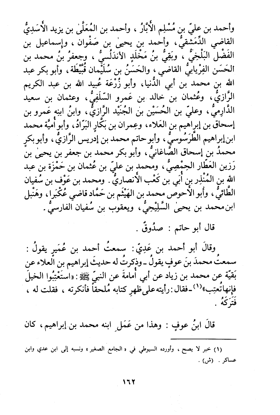 وَقَال أَبُو أَحْمَدَ بْن عَدِيّ: سمعت أَحْمَد بْن عُمَير يَقُولُ: سَمِعْتُ مُحَمَّدَ بْنَ عَوْفٍ يَقُولُ - وذَكَرْتُ لَهُ حَدِيثَ إِبْرَاهِيمَ بْنِ الْعَلاءِ عَنْ بَقِيَّةَ عَنْ مُحَمَّدِ بْنِ زِيَادٍ عَن أَبِي أُمَامَةَ عَنِ النَّبِيِّ صَلَّى اللَّهُ عَلَيْهِ وسَلَّمَ: اسْتَعْتِبُوا الْخَيْلَ فَإِنَّهَا تُعْتِبُ" (1) - فَقَالَ: رَأَيْتُهُ عَلَى ظهر كتابه ملحقا فأنكرة، فَقُلْتُ لَهُ، فَتَرَكَهُ.