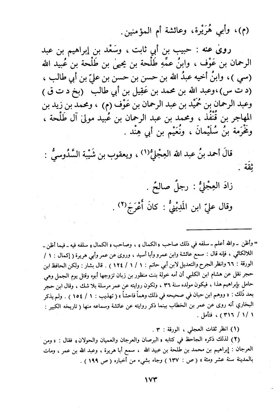 = وأظن - والله أعلم - سلفه في ذلك صاحب "الكمال"، وصاحب "الكمال" سلفه فيه - فيما أظن - اللالكائي، فإنه قال: سمعت عائشة وابن عَمْرو وأبا أسيد، وروى عن عُمَر وأبي هُرَيْرة (إكمال: 1 / الورقة: 66 وانظر الجرح والتعديل لابن أَبي حاتم: 1 / 1 / 124) . قال بشار: ولكن الحافظ ابن حجر نقل عن هشام ابن الكلبي أن أمه خولة بنت منظور بْن زبان تزوجها أبوه وقتل يوم الجمل وهي حامل بإبراهيم هذا، فيكون مولده سنة 36، وتكون روايته عن عُمَر مرسلة بلا شك، وَقَال ابن حجر بعد ذلك: ووهم ابن حبان في صحيحه في ذلك وهما فاحشا" (تهذيب: 1 / 154) . ولم يذكر البخاري أنه روى عن عُمَر بْن الخطاب بينما ذكر روايته عن عائشة وسماعه منها (تاريخ الكبير: 1 / 1 / 316) ، فتأمل.