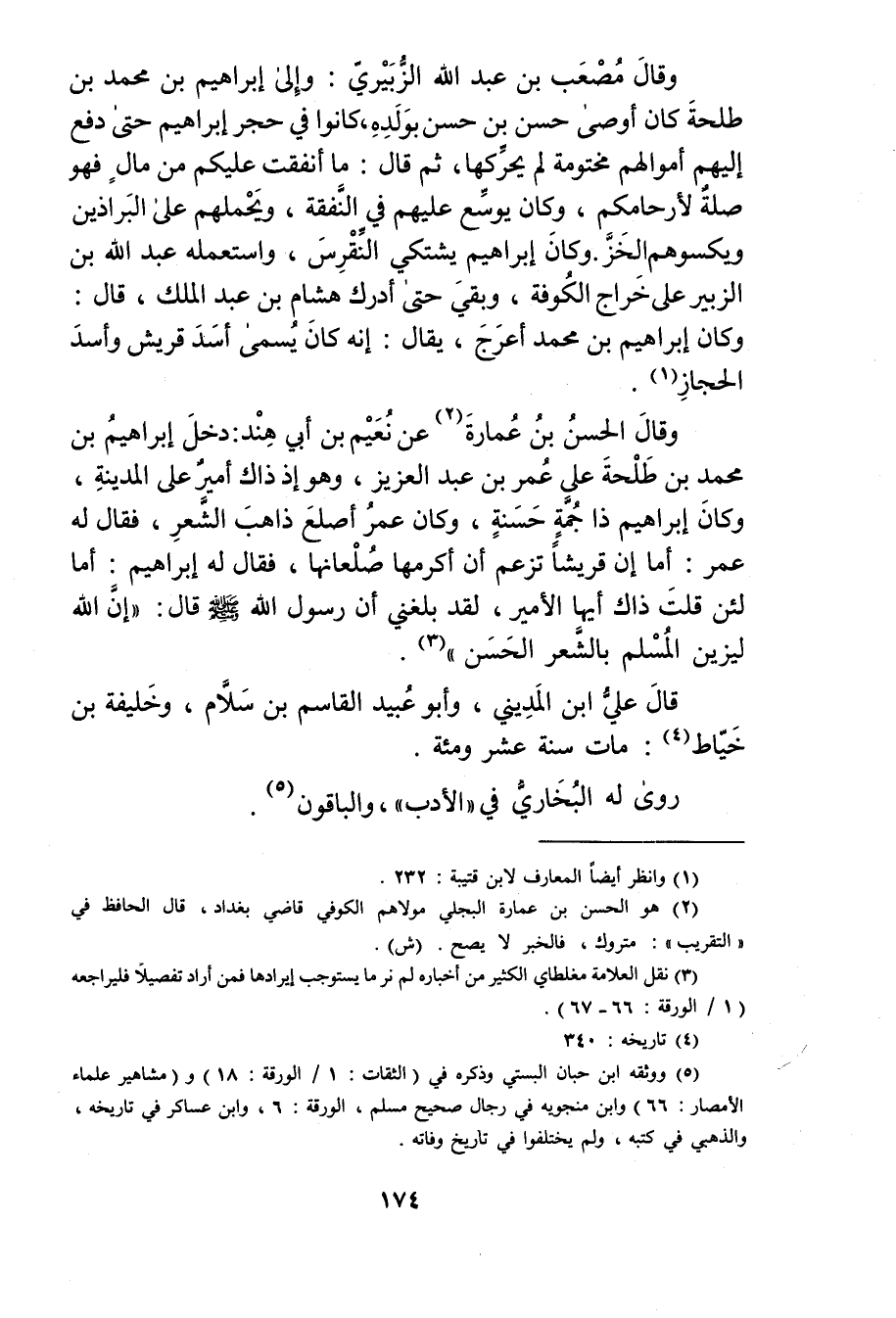 وَقَال الحسن بْن عمارة (2) عَن نعيم بْن أَبي هند: دخل إِبْرَاهِيم بْن مُحَمَّد بْن طلحة على عُمَر بْن عَبْد العزيز، وهو إذ ذاك أمير على المدينة، وكان إِبْرَاهِيم ذا جمة حسنة، وكان عُمَر أصلع ذاهب الشعر، فَقَالَ له عُمَر: أما إن قريشا تزعم أن أكرمها صلعانها، فَقَالَ له إِبْرَاهِيم: أما لئن قلت ذاك أيها الأمير، لقد بلغني أن رَسُول اللَّهِ صلى الله عليه وسلم قال: إن الله ليزين المسلم بالشعر الحسن" (3) .