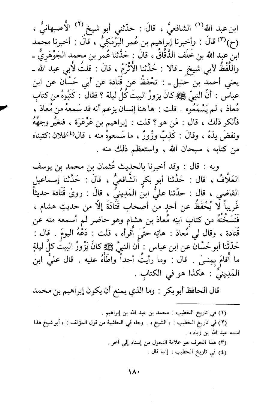 ابن عَبد اللَّهِ (1) الشَّافِعِيُّ، قال: حَدَّثَنِي أَبُو شَيْخٍ (2) الأَصْبَهَانِيُّ، (ح) (3) قال: وأَخْبَرَنَا إِبْرَاهِيمُ بْنُ عُمَر الْبَرْمَكِيُّ، قال: أخبرنا مُحَمَّدِ ابْنِ عَبد اللَّهِ بْنِ خَلَفٍ الدَّقَّاقُ، قال: حَدَّثَنَا عُمَر بْنُ مُحَمَّدٍ الْجَوْهَرِيُّ - واللَّفْظُ لأَبِي شَيْخٍ - قَالا: حَدَّثَنَا الأَثْرَمُ، قال: قلتُ لأَبِي عَبد اللَّهِ، يَعْنِي أَحْمَدَ بْنَ حَنْبَلٍ: تَحْفَظُ عَنْ قَتَادَةَ عَن أَبِي حَسَّانٍ عَنِ ابْنِ عَبَّاسٍ: أَنَّ النَّبِيَّ صَلَّى اللَّهُ عَلَيْهِ وسَلَّمَ كَانَ يَزُورُ الْبَيْتَ كُلَّ لَيْلَةٍ؟ فَقَالَ: كَتَبُوهُ مِنْ كِتَابِ مُعَاذٍ، لَمْ يَسْمَعُوهُ. قلت: ها هنا إِنْسَانٌ يَزْعُمُ أَنَّهُ قَدْ سَمِعَهُ مِنْ مُعَاذٍ، فَأَنْكَرَ ذَلِكَ، قال: مَنْ هُوَ؟ قُلْتُ: إِبْرَاهِيمُ بْنُ عَرْعَرَةَ، فَتَغَيَّرَ وجْهُهُ ونَفَضَ يَدَهُ، وَقَال: كَذِبٌ وزُورٌ، مَا سَمِعُوهُ مِنْهُ، قال (4) فَلانٌ: كَتَبْنَاهُ مِنْ كِتَابِهِ، سُبْحَانَ اللَّهِ، واسْتَعْظَمَ ذَلِكَ مِنْهُ.