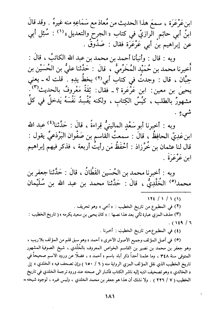 ابن عرعرة، سمع هذا الحديث من معاذ مع سماعه منه غيره، وقد قال ابن أَبي حاتم الرازي في كتاب"الجرح والتعديل" (1) : سئل أبي عَن إِبْرَاهِيم بْن أَبي عرعرة فَقَالَ: صدوق.