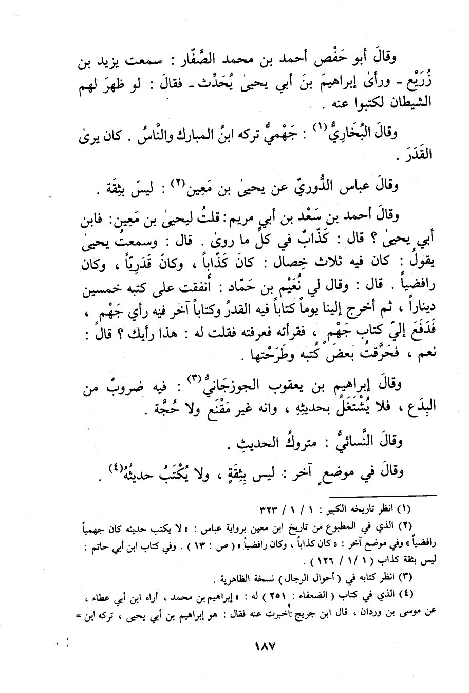 (2) الذي في المطبوع من تاريخ ابن مَعِين برواية عباس: لا يكتب حديثه كان جهميا رافضيا"وفي موضغ آخر: كان كذابا، وكان رافضيا" (ص: 13) . وفي كتاب ابن أَبي حاتم: ليس بثقة كذاب (1 / 1 / 126) .