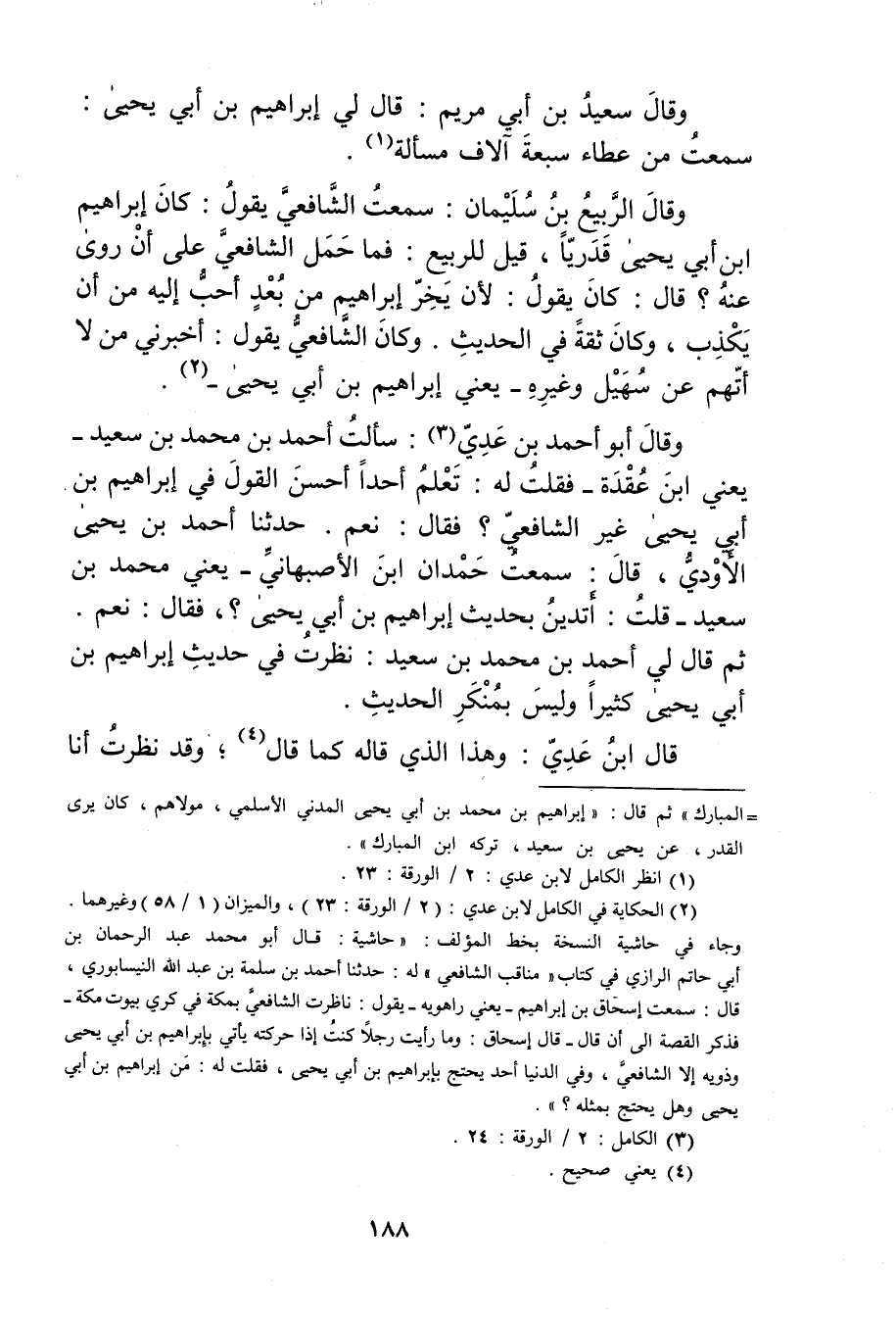 (2) الحكاية في الكامل لابن عدي: (2 / الورقة: 23) ، والميزان (1 / 58) وغيرهما. وجاء في حاشية النسخة بخط المؤلف: حاشية: قال أَبُو مُحَمَّد عبد الرحمن بْن أَبي حاتم الرازي في كتاب"مناقب الشافعي"له: حَدَّثَنَا أحمد بْن سلمة بْن عَبد اللَّهِ النيسابوري، قال: سمعت إسحاق بن إبراهيم، يعني راهويه - يقول: ناظرت الشافعي بمكة في كرى بيوت مكة - فذكر القصة إلى أن قال، قال إسحاق: وما رأيت رجلا كنت إذا حركته يأتي بإبراهيم بن أَبي يحيى وذويه إلا الشافعي، وفي الدنيا أحد يحتج بإبراهيم بن أَبي يحيى، فقلت له: من إبراهيم بن أَبي يحيى وهل يحتج بمثله؟.