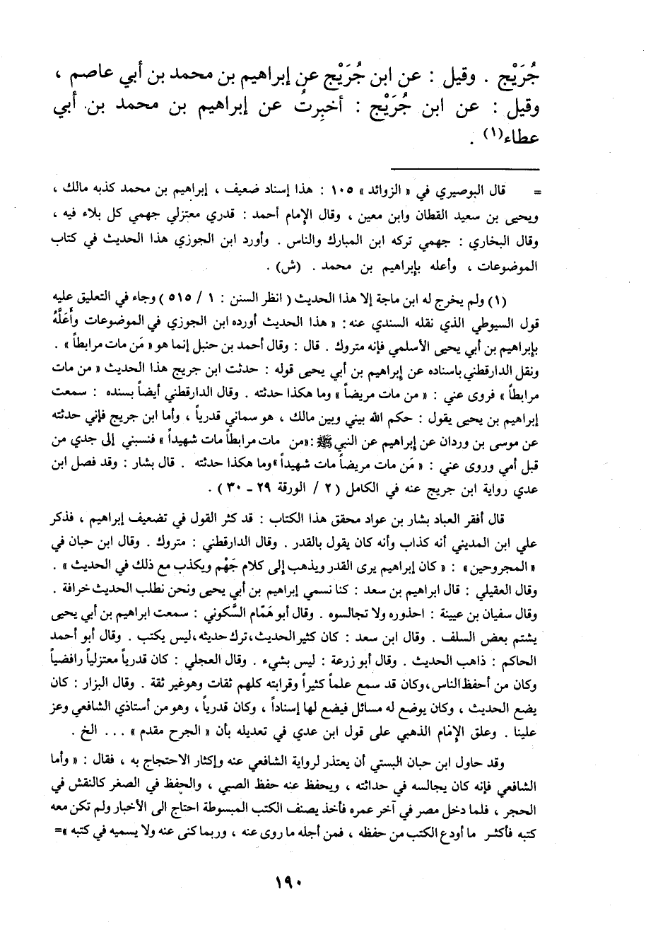 قال أفقر العباد بشار بن عواد محقق هذا الكتاب: قد كثر القول في تضعيف إبراهيم، فذكر علي ابن المديني أنه كذاب وأنه كان يقول بالقدر. وَقَال الدَّارَقُطْنِيُّ: متروك. وَقَال ابن حبان في "المجروحين": كان إبراهيم يرى القدر ويذهب إلى كلام جهم ويكذب مع ذلك في الحديث". وَقَال العقيلي: قال إبراهيم بن سعد: كنا نسمي إبراهيم بن أَبي يحيى ونحن نطلب الحديث خرافة وَقَال سفيان بن عُيَيْنَة: احذروه ولا تجالسوه. وَقَال أبو همام السكوني: سمعت ابراهيم بن أَبي يحيى يشتم بعض السلف. وَقَال ابن سعد: كان كثير الحديث، ترك حديثه، ليس يكتب. وَقَال أبو أحمد الحاكم: ذاهب الحديث. وَقَال أبو زُرْعَة: ليس بشيءٍ. وَقَال العجلي: كان قدريا معتزليا رافضيا وكان من أحفظ الناس، وكان قد سمع علما كثيرا وقرابته كلهم ثقات وهو غير ثقة. وَقَال البزار: كان يضع الحديث، وكان يوضع له مسائل فيضع لها إسناد، وكان قدريا، وهو من أستاذي الشافعي وعز علينا. وعلق الإمام الذهبي على قول ابن عدي في تعديله بأن"الجرح مقدم". الخ.