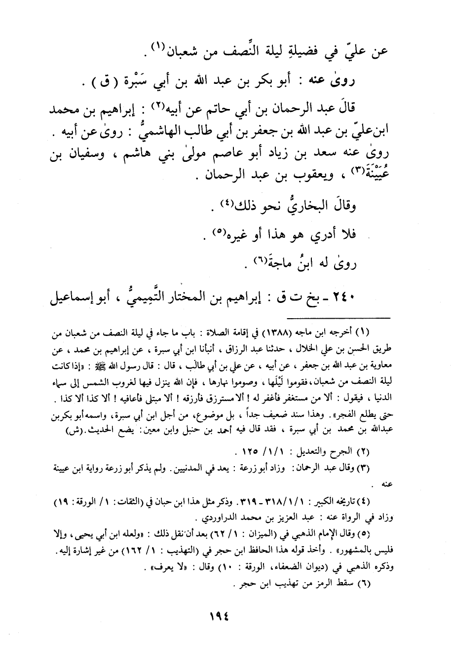(1) أخرجه ابن ماجه (1388) في إقامة الصلاة: باب ما جاء فِي لَيْلَةِ النِّصْفِ مِنْ شَعْبَانَ من طريق الحسن بن علي الخلال، حَدَّثَنَا عبد الرزاق، أنبأنا ابن أَبي سَبْرَةَ، عَنْ إِبْرَاهِيمَ بْنِ مُحَمَّدٍ، عَنْ مُعَاوِيَةَ بْنِ عَبد اللَّهِ بْنِ جَعْفَرٍ، عَن أَبِيهِ، عن علي بْن أَبي طالب، قال: قال رَسُولُ اللَّهِ صلى الله عليه وسلم: إِذَا كَانَتْ لَيْلَةُ النِّصْفِ مِنْ شَعْبَانَ، فَقُومُوا لَيْلَهَا، وصُومُوا نَهَارَهَا، فَإِنَّ اللَّهَ يَنْزِلُ فِيهَا لِغُرُوبِ الشَّمْسِ إِلَى سماء الدنيا، فيقول: ألا من مستغفر فأغفر له! ألا مسترزق فأرزقه! ألا مبتلى فأعافيه! الا كذا الا كذا. حتى يطلع الفجر". وهذا سند ضعيف جدا، بل موضوع، من أجل ابن أَبي سبرة، واسمه أبو بكر بن عَبد الله بن محمد بن أَبي سبرة، فقد قال فيه أحمد بن حنبل وابن مَعِين: يضع الحديث. (ش) .