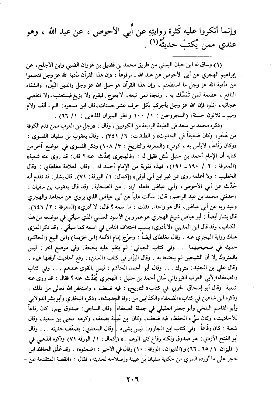 فقلت: ما اسمه؟ قال: لا أدري" (المعرفة: 2 / 646) . قال بشار أيضا: أبو عياض شيخ الهجري هو عَمْرو بن الأسود العنسي الذي سيأتي في موضعه من هذا الكتاب، وقد قال ابن المديني"لا أدري"بسبب اختلاف الناس في اسمه كما سيأتي. وقد ذكر المزي هناك رواية الهجري عنه. وَقَال مغلطاي أيضا: وخرج إمام الأئمة (ابن خزيمة) وابن البيع (الحاكم) حديثه في صحيحيهما..وفي كتاب الجياني: لم ينقم عليه بحجة. وفي موضع آخر: ليس بالمتروك إلا أن الشيخين لم يحتجا به. وَقَال البزار في كتاب"السنن": رفع أحاديث أوقفها غيره. وَقَال علي بن الجنيد: متروك.. وَقَال أبو أحمد الحاكم: ليس بالقوي عندهم..وفي كتاب"الضعفاء"لابي العرب القيرواني سئل أحمد بن حنبل: الهجري يحدث به؟ فقال: قد روى عنه شعبة وَقَال أبو إسحاق الحربي في كتاب"التاريخ": فيه ضعف، واستغفر الله تعالى من ذلك. وذكره ابن شاهين في كتاب"الضعفاء والكذابين من رواة الحديث"، وذكره البخاري وأبو بشر الدولابي وأبو القاسم البلخي وأبو جعفر العقيلي في جملة الضعفاء. وَقَال الساجي: صدوق يهم، كان رفاعا