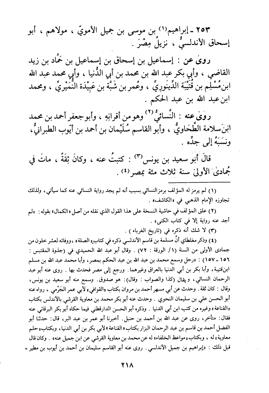 (4) وذكر مغلطاي أن مسلمة بن قاسم الاندلسي ذكره في كتاب"الصلة"، ووفاته لعشر خلون من جمادى الأولى من السنة (1 / الورقة: 72) . وَقَال أَبُو عَبْد اللَّهِ الحميدي في (جذوة المقتبس: 156 - 157) : رحل وسمع مُحَمَّد بْن عَبد اللَّهِ بْن عبد الحكم بمصر، وأبا مُحَمَّد عَبد الله بْن مسلم ابن قتيبة، وأبا بكر بن أَبي الدنيا بالعراق وغيرهما. ورجع إلى مصر فحدث بها. روى عنه أبو عبد الرحمن النَّسَائي، ويُقال (كذا والصواب: وَقَال) : هو صدوق. وسمع منه أبو سَعِيد بن يونس، وَقَال: كان ثقة. وحدث عَن أبي مسهر أحمد بن مسهر أحمد بن مروان بكتاب"القوافي"لابي عُمَر الجرمي، رواه عنه أبو الحسن علي بن سُلَيْمان النحوي. وحدث عنه أبو بكر محمد بن معاوية القرشي بالاندلس بكتاب"القناعة"وغيره من كتب ابن أَبي الدنيا. وذكره أبو الحسن الدارقطني فيما حكاه أبو بكر البرقاني عنه فقال: متأخر، روى عن عَبد الله بن أحمد بن حنبل. أخبرنا أبو عُمَر بن عَبد الْبَرِّ، قال: حَدَّثَنَا أبو الفضل أحمد بن قاسم بن عبد الرحمن البزار بكتاب"القناعة"لأبي بكر بن أَبي الدنيا، وبكتاب"حلم معاوية"له، وبكتاب"مواعظ الخلفاء"له عن محمد بن معاوية القرشي عن ابن جميل عنه". وكان قال قبل ذلك: إبراهيم بن جميل الاندلسي. روى عنه أبو القاسم سُلَيْمان بن أحمد بن أيوب بن مطير =