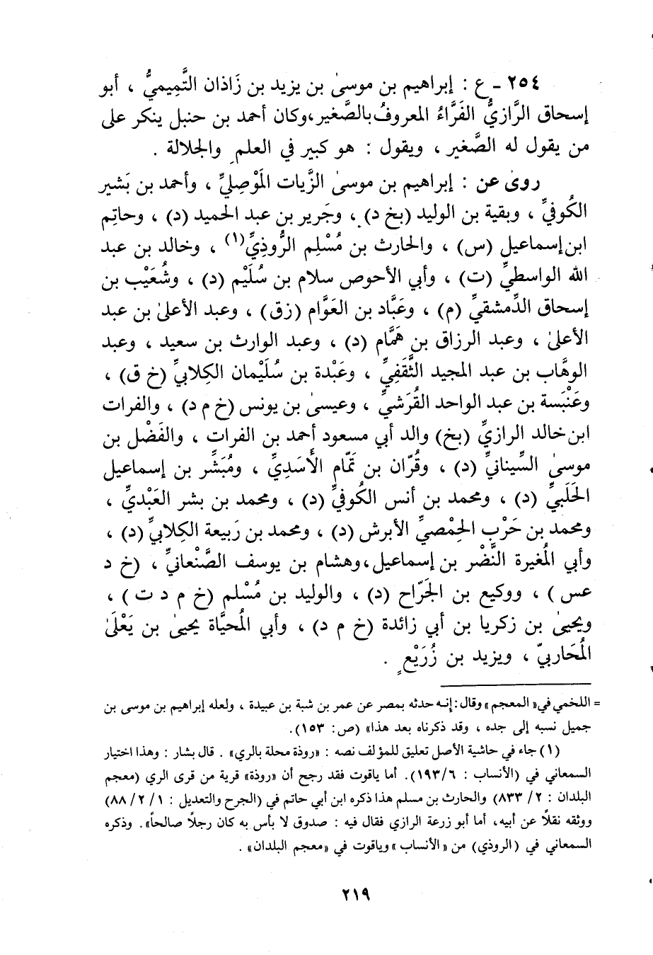 254- ع: إِبْرَاهِيم بن موسى بن يزيد بن زاذان التميمي، أبو إسحاق الرازي الفراء المعروف بالصغير، وكان أحمد بْن حنبل ينكر على من يقول له الصغير، ويقول: هو كبير في العلم والجلالة