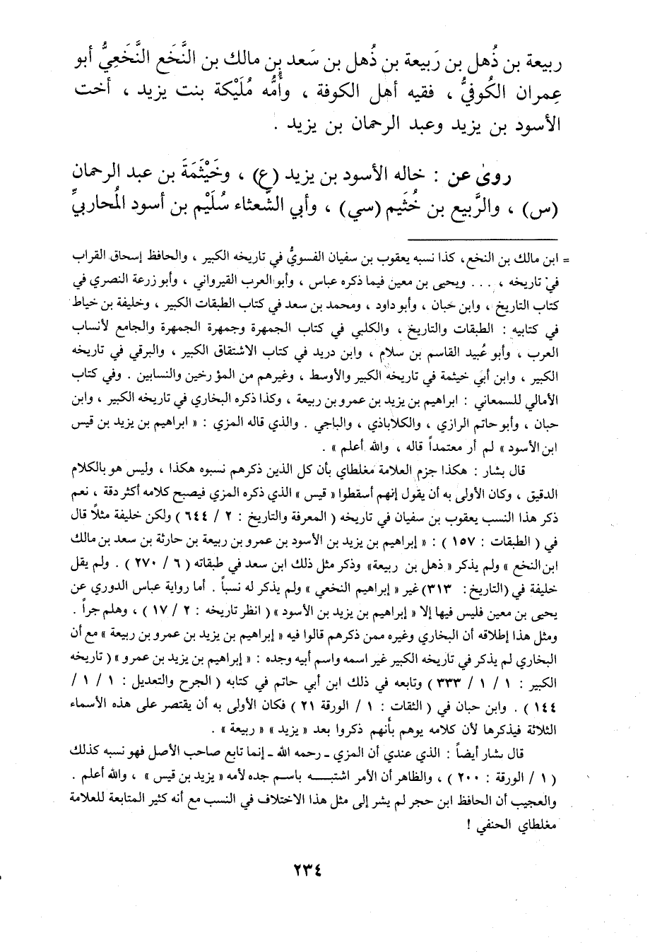= ابن مالك بن النخع، كذا نسبه يعقوب بن سفيان الفسوي في تاريخه الكبير، والحافظ إسحاق القراب في تاريخه..ويحيى بن مَعِين فيما ذكره عباس، وأبو العرب القيرواني، وأبو زُرْعَة النصري في كتاب التاريخ، وابن حبان، وأَبُو داود، ومُحَمَّد بْن سعد في كتاب الطبقات الكبير، وخليفة بن خياط في كتابيه: الطبقات والتاريخ، والكلبي في كتاب الجمهرة وجمهرة الجمهرة والجامع لانساب العرب، وأبو عُبَيد القاسم بن سلام، وابن دريد في كتاب الاشتقاق الكبير، والبرقي في تاريخه الكبير، وابن أَبي خيثمة في تاريخه الكبير والاوسط، وغيرهم من المؤرخين والنسابين. وفي كتاب الامالي للسمعاني: ابراهيم بن يزيد بن عَمْرو بن ربيعة، وكذا ذكره البخاري في تاريخه الكبير، وابن حبان، وأبو حاتم الرازي، والكلاباذي، والباجي. والذي قاله المزي: ابرهيم بن يزيد بن قيس ابن الأسود"لم أر معتمدا قاله، والله أعلم". قال بشار: هكذا جزم العلامة مغلطاي بأن كل الذين ذكرهم نسبوه هكذا، وليس هو بالكلام الدقيق، وكان الاولى به أن يقول إنهم اسقطوا"قيس"الذي ذكره المزي فيصبح كلامه أكثر دقة، نعم ذكر هذا النسب يعقوب بن سفيان في تاريخه (المعرفة والتاريخ: 2 / 644) ولكن خليفة مثلا قال في (الطبقات: 157) : إبراهيم بن يزيد بن الأسود بن عَمْرو بن ربيعة بن حارثة بن سعد بن مالك ابن النخع"ولم يذكر"ذهل بن ربيعة"وذكر مثل ذلك ابن سعد في طبقاته (6 / 270) . ولم يقل خليفة في (التاريخ: 313) غير"إبراهيم النخعي"ولم يذكر له نسبا. أما رواية عباس الدوري عن يحيي بن مَعِين فليس فيها إلا"إبراهيم بن يزيد بن الأسود" (انظر تاريخه: 2 / 17) ، وهلم جرا. ومثل هذا إطلاقه أن البخاري وغيره ممن ذكرهم قالوا فيه"إبراهيم بن يزيد بن عَمْرو بن ربيعة"مع أن البخاري لم يذكر في تاريخه الكبير غير اسمه واسم ابيه وجده: إبراهيم بن يزيد بن عَمْرو" (تاريخه الكبير: 1 / 1 / 333) وتابعه في ذلك ابن أَبي حاتم في كتابه (الجرح والتعديل: 1 / 1 / 144) .